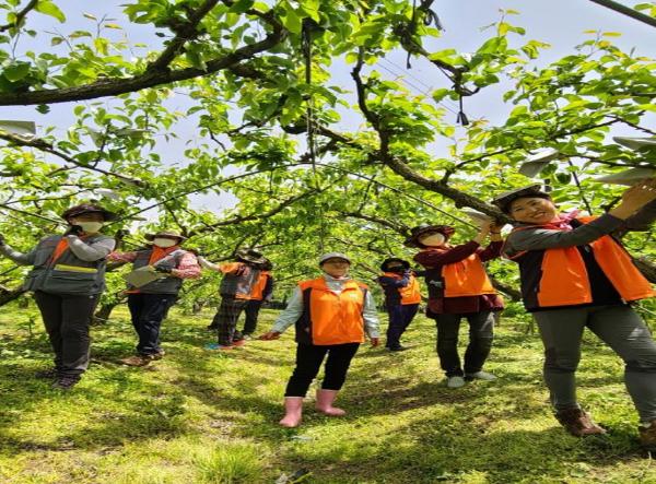 한솔동 주민자치회 위원 10여 명은 지난 14일 금남면 배 농가를 방문해 열매솎기와 봉지 씌우기 등 일손을 도왔다.
