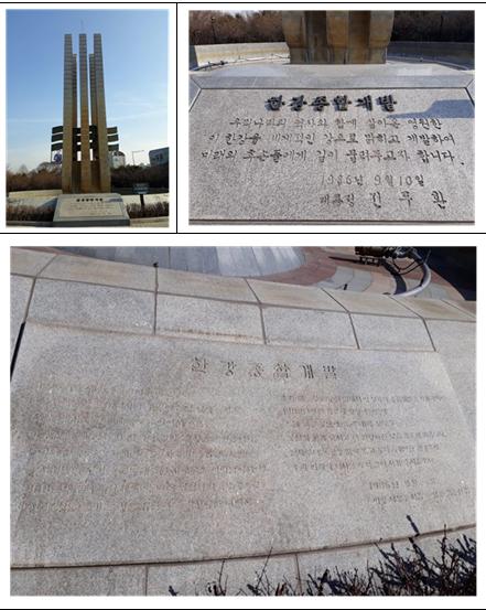 조형물 한가운데는 한강종합개발에 대해 당시 대통령인 전두환 명의로 “우리나라의 역사와 함께 살아온 영원한 이 한강을 세계적인 강으로 맑히고 개발하여 미래의 후손들에게 길이 물려주고자 합니다.”라는 표지석 문구가 선명하게 새겨져 있다.