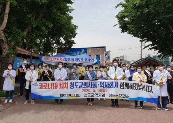 청도군(군수 이승율)은 코로나19 방역체계가 사회적 거리두기에서 생활속 거리두기로 전환됨에 따라 14일 청도역 광장에서 박용준 청도군의사회장과 이근우 청도군약사회장이 중심이 되어 코로나19퇴치 청정 청도 및 지역경제 살리기 홍보 캠페인을 실시하였다.