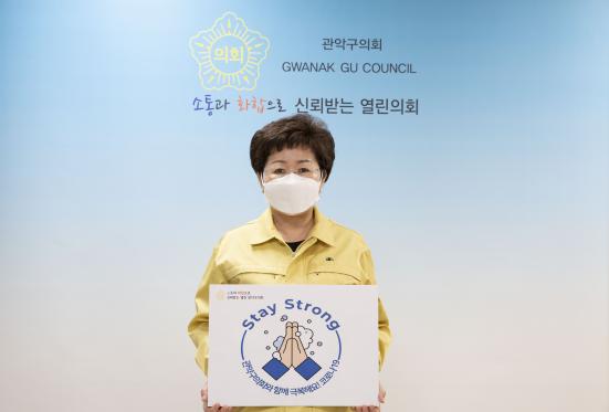 왕정순 관악구의회 의장이 15일, 코로나19 극복을 위한 ‘스테이 스트롱(Stay Strong)’릴레이 캠페인에 동참했다.