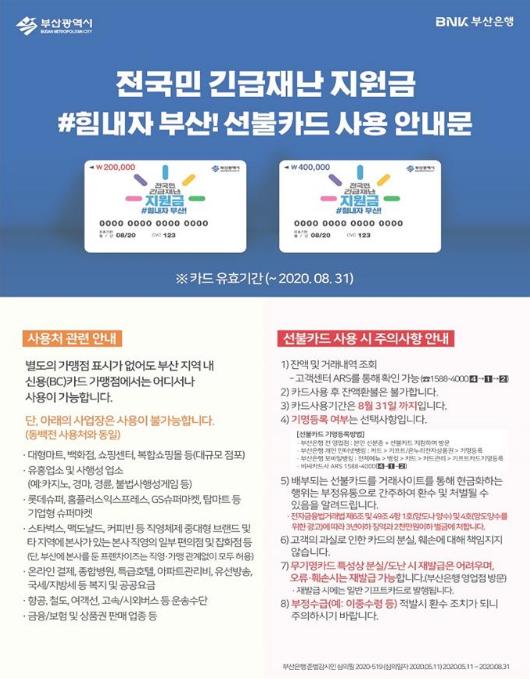 선불카드는 20만원권과 40만원권 총 2가지로 지급된다. 선불카드는 무기명으로 지급되기 때문에 수령 후 기명 등록을 해야만 분실 및 훼손시 재발급이 가능하다. 재발급은 부산은행 영업점에서만 가능하다. 동백전 사용처와 동일하며 잔액 및 거래내역 조회는 고객센터 ARS(☎1588-4000)를 통해 확인할 수 있다.