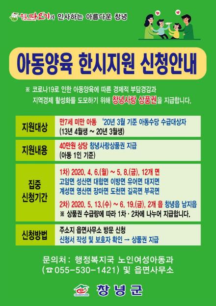 창녕군(군수 한정우)은 3일, 코로나19로 인한 아동양육에 대한 경제적 부담을 줄이고자 만7세 미만의 아동수당 수급자(2,300여명)에게 창녕사랑 상품권을 지급한다고 밝혔다.