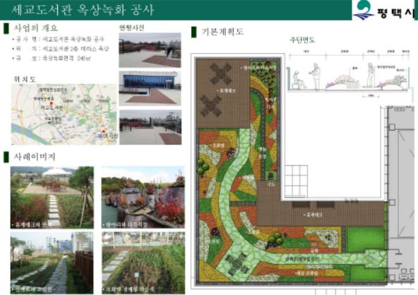 세교도서관 옥상녹화 사업은 도시 열섬화와 미관에 취약한 옥상테라스의 시멘트 패널을 제거하고 인공 경량토 위에 황금측백 외 5종 370주, 참나리 외 25종 5,048본 등 계절초화와 허브식물을 식재하고, 현무암 판석과 멧돌을 이용한 산책로 조성, 장독대, 조형물 등이 설치된다.