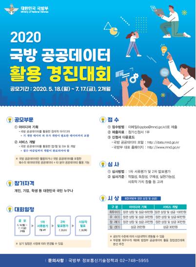 국방부는 국방 공공데이터를 활용한 창의적 아이디어와 비즈니스 모델을 발굴하기 위해 5월 18일(월)부터 7월 17일(금)까지 ‘2020년 국방 공공데이터 활용 경진대회’를 개최한다고 밝혔다.
