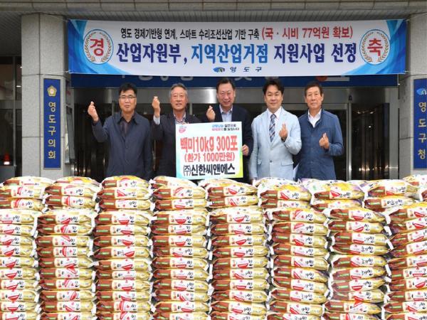 ㈜신한씨앤에스(회장 성영진)는 5월 18일 영도구에 이웃돕기 성품으로 백미 10kg 300포(환가 1,000만원)를 전달하였다.
