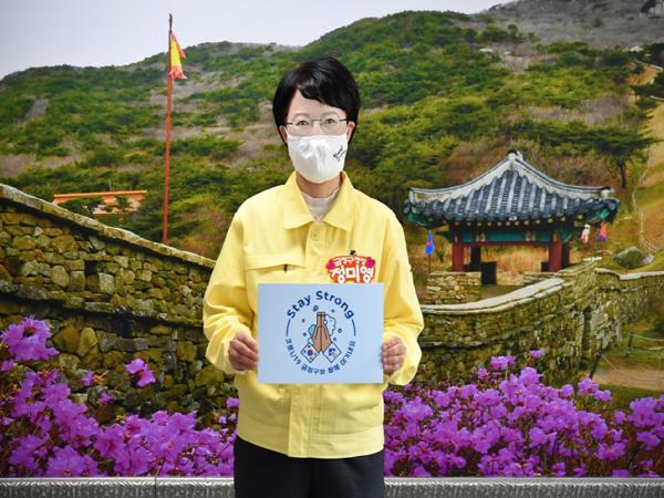 정미영 금정구청장이 지난 16일 코로나19로 어려움을 겪고 있는 모든 이들에게 지치지 말고 함께 이겨내자는 희망의 메시지를 전하기 위해 코로나19 극복 ‘스테이 스트롱(Stay Strong)’캠페인에 동참했다.