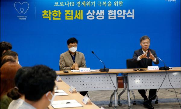 19일 김승수 전주시장과 원룸, 오피스텔, 아파트, 단독주택 등 주택 건물주 33명은 코로나 19로 힘들어하는 385세대 세입자들의 고통을 분담하고 주거안정을 돕기 위해 집세를 인하하는 ‘착한 집세 상생 협약’을 체결했다. 이날 상생협약식에는 14명의 주택 건물주가 참석한 가운데 진행됐다. 이로써 상가 임대료와 주택 집세를 내려주는 협약을 체결한 건물주는 총 213명으로, 853개 상가·주택 세입자들이 혜택을 받게 됐다. 앞서 상가 임대료를 인하키로 협약서를 체결한 건물주는 180명이며, 468세대가 해당된다.