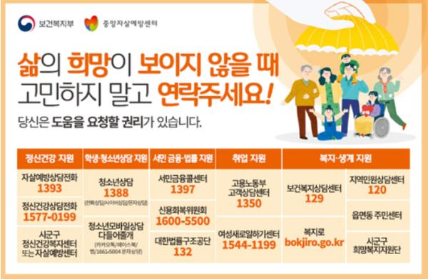 주변에 우울감을 호소하거나 자살 충동으로 도움이 필요한 사람이 있다면 ‘24시간 자살예방상담전화 1393’ 또는 ‘익산시정신건강복지센터(841-4235)로 연락하면 된다.