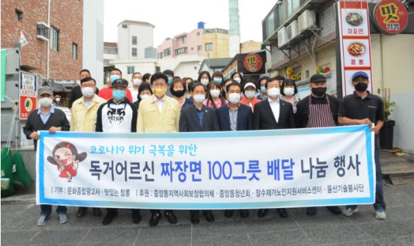 사랑과 정성이 담긴 짜장면과 함께 먹을 수 있는 단무지와 양파, 후식으로 먹을 야쿠르트는 최근 코로나19로 인해 많은 인원이 한 장소에 모이기 어려운 만큼, 장수재가노인지원서비스센터와 중앙동 지역사회보장협의체, 울산기술봉사단과 중앙동청년회가 차량 지원 등을 통해 어르신들이 댁에서 편하게 식사를 드실 수 있게 배달했다.
