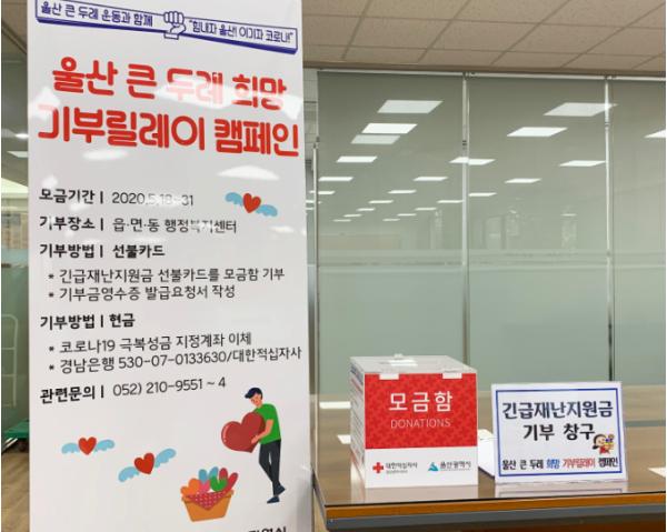 또 대한적십자사 울산지사(경남, 530 - 07 - 0133630), 울산사회복지공동모금회(경남, 632 - 07 - 0008075)의 ‘코로나19 위기 극복 범시민 모금 운동’ 계좌를 통해 현금으로도 참여 가능하다.