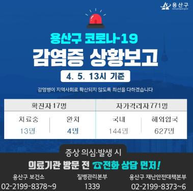 성장현 용산구청장은 “해외유입으로 인한 신규확진자의 지역사회 전파를 막기 위해 이들에 대한 관리를 강화했다”면서 “구민들께서도 불필요한 외출을 피하고 손씻기 등 개인위생 수칙을 철저히 지켜주시기 바란다”고 강조했다.
