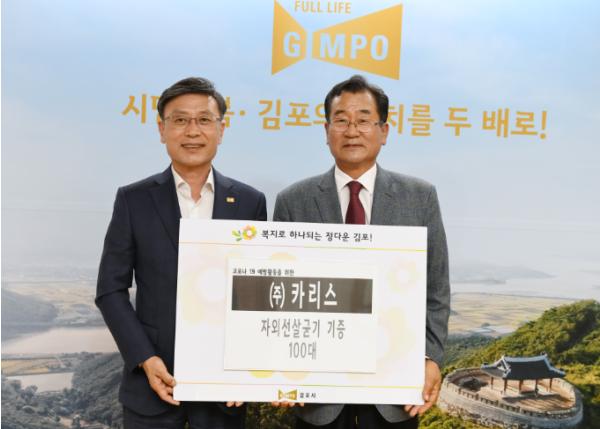 ㈜카리스(대표 이학용)는 19일 코로나19 방역활동 지원을 위해 자외선 살균기 100대를 김포시에 제공했다.