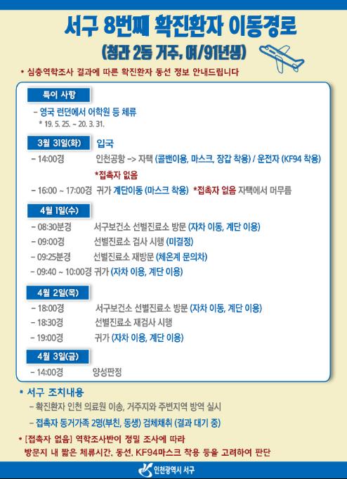 서구 재난안전대책본부(본부장 이재현 서구청장)에 따르면, 영국(런던)에서 지난달 31일 귀국한 A씨(91년생 여성, 청라2동)가 3일 코로나19 양성 판정을 받았다. 이로써 서구 확진환자는 모두 8명(완치 2명)이 됐다.