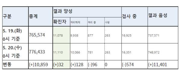 질병관리본부 중앙방역대책본부(본부장 정은경)는 5월 20일 0시 현재, 신규 확진자가 32명 발생하여 총 누적 확진자수는 11,110명(해외유입 1,189명(내국인 89.0%))이라고 밝혔다.