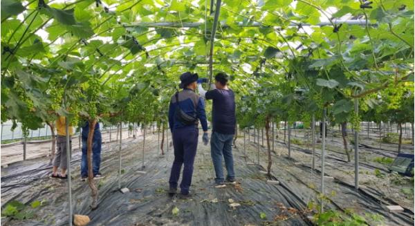 김천시 원도심재생과와 김천시도시재생지원센터 직원 10명은 20일 남면 옥산리 소재의 포도농가를 방문해 농촌일손돕기에 나섰다.