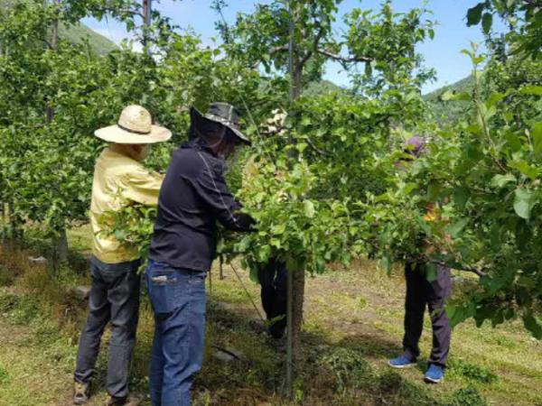 이날 맑은물사업소 직원 10여명은 농촌인구 감소와 고령화, 코로나19로 인해 일손이 부족하여 어려움을 겪고 있는 농가를 방문하여 사과적과 작업에 구슬땀을 흘렸다.