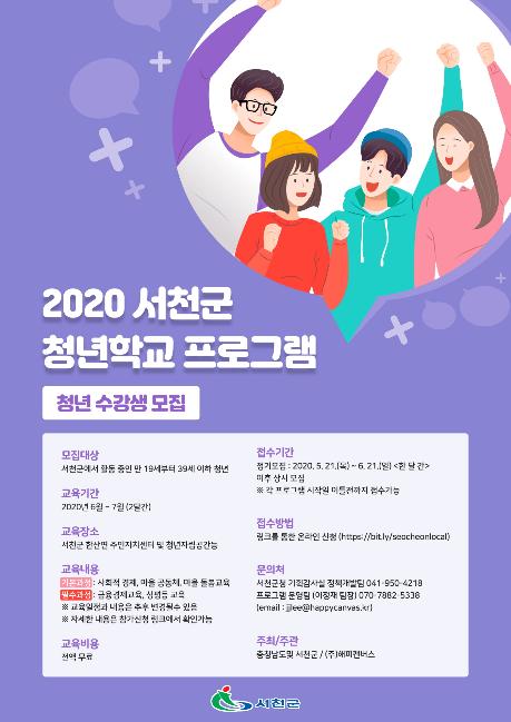 서천군(군수 노박래)은 지역 청년의 자립과 정착을 위해 지역 내 만 19세 이상부터 만 39세 이하의 청년을 대상으로 ‘청년학교 프로그램’을 운영한다.