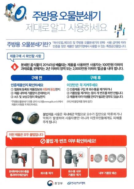 정부도 주방용오물분쇄기를 사용하는 이용자가 늘어남에 따라 불법제품 판매자와 이를 사용하는 이용자에 대해 과태료나 벌금을 부과하며 적극적으로 계도하고 나섰다. 군도 주방용오물분쇄기 이용 안내문을 각 읍면에 시달하여, 읍면 이장회의나 전광판 등을 이용해 적극적으로 홍보해줄 것을 요청했다.