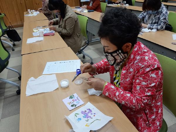 특히 한국프레스플라워협회 누름꽃(압화) 전문 강사를 초빙해 압화 공예 기초 이론과 실습 교육을 병행해 교육생들의 호응도가 높다.