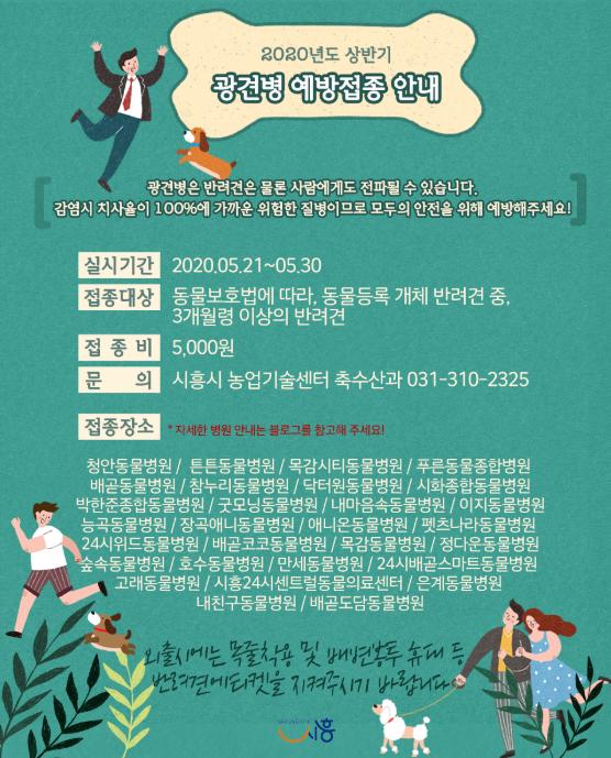 시흥시(시장 임병택)는 2020년 봄을 맞아 21일부터 오는 30일까지 관내 동물병원 26개소에서 광견병 예방접종을 실시한다.