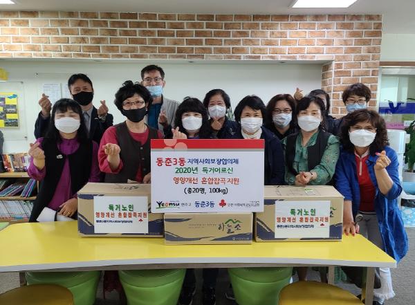 이날 전달된 혼합 잡곡 100kg은 연합모금으로 마련됐으며, 코로나19 장기화로 자칫 건강관리에 소홀할 수 있는 저소득 독거어르신 가정에 동 지역사회보장협의체 위원과 복지통장으로 구성된 행복배달부들이 직접 방문 전달했다.