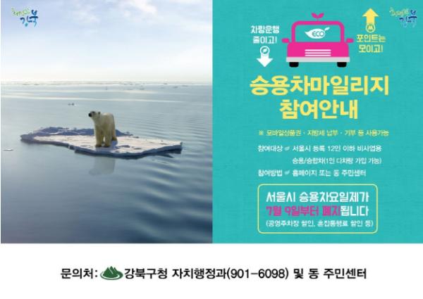 강북구(구청장 박겸수)가 자동차 사용을 줄여 온실가스 및 미세먼지를 감축하기 위해 승용차마일리지 신규 가입자를 모집한다.