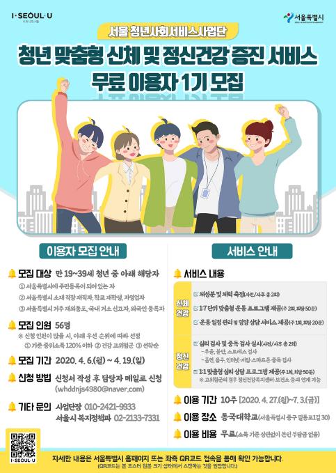서울시는 ‘서울 청년사회서비스사업단’에서 제공하는 신체 및 정신건강 증진 서비스를 10주간 무료로 이용할 청년들을 6일(월)부터 모집한다.
