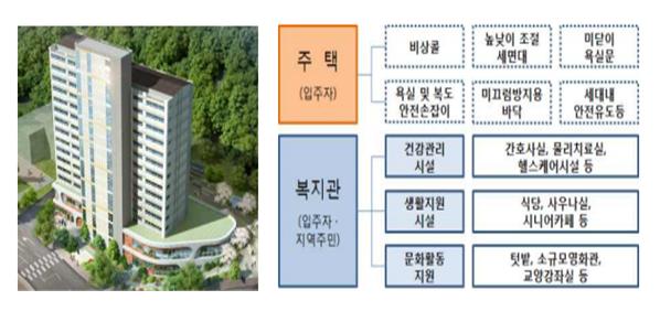 고령자복지주택은 정부의 주거복지로드맵 중 고령자 주거복지 강화를 위해 어르신들의 생활에 불편함이 없도록 설계한 주택과 사회복지시설이 복합 설치된 영구임대주택으로 주거와 돌봄을 한 번에 받을 수 있는 고령자 맞춤형 주택이다.