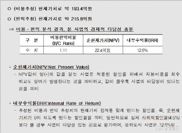 충남정보문화산업진흥원(원장 맹창호, 이하 진흥원)은 ㈔한국지방재정학회에 지방재정투자를 위한 ‘문화도시천안 조성사업’의 경제적 타당성 분석을 의뢰한 결과 비용 대 편익(B/C)이 1.11로 평가돼 경제적 효과가 충분한 것으로 나타났다고 25일 밝혔다. 통상 B/C가 1이상이면 해당사업에 경제성이 높아 추진가치가 있다고 평가한다.