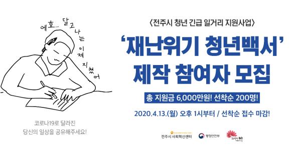 전주시와 전주시 사회혁신센터는 코로나19 전주시 청년 긴급 일거리 지원사업의 일환으로 ‘재난위기 청년백서’제작에 참여할 청년 200명을 13일 오후 1시부터 선착순 모집한다.