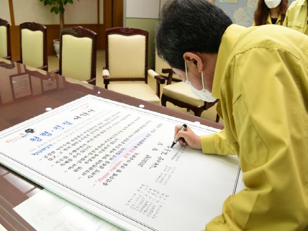 이번 캠페인은 간부 공무원이 솔선수범하여 청렴한 김천으로 나아가겠다는 취지로 청렴서약서에 서명하는 방식으로 진행하였으며, 간부공무원의 청렴 리더십 제고와 청렴한 조직문화 조성으로 시민들에게 신뢰받는 공직사회 구현을 위해 실시하였다.