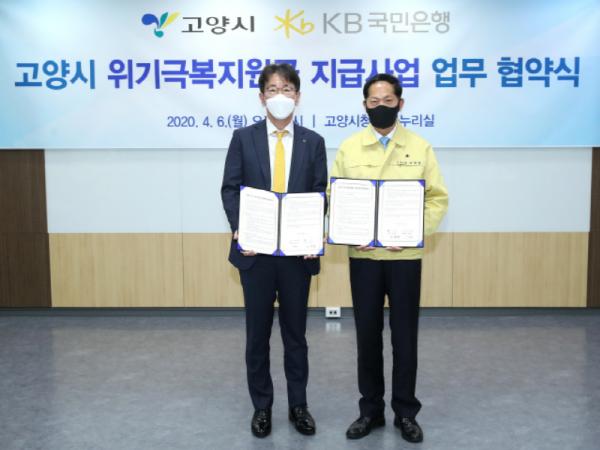 이재준 고양시장과 이재근 국민은행 부행장은 6일 위기극복지원금 사업 추진을 위한 선불카드 발급 업무협약을 체결했다. 국민은행은 카드를 발행해 고양시 측에 전달하고 관리·운영을 담당하게 된다.