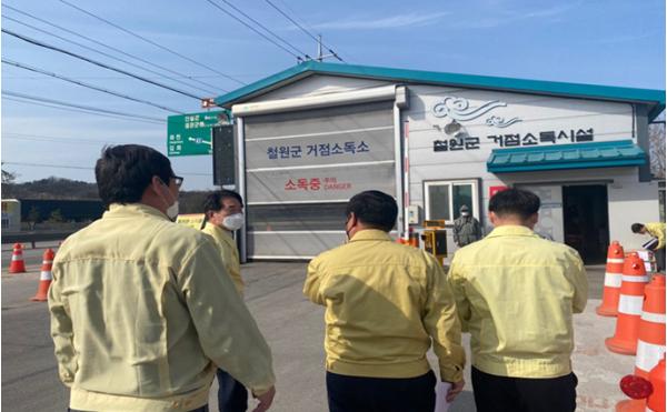 우선, 갈말읍에 위치한 거점소독시설을 방문하여 방역점검과 함께 근무자들을 격려한 후, 국내 발생 초기부터 6개월 이상 강원도 방역의 최전선에서 총력을 다 하고 있는 철원군 방역 공무원들의 노고를 격려하고 철저한 방역을 당부했다.