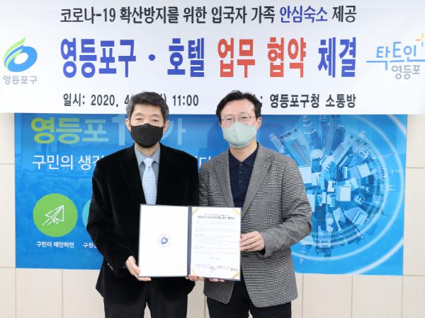 채현일 영등포구청장과 홍지명 토요코인 코리아 사장은 6일(월) ‘코로나19 등 감염병 대응을 위한 업무협약(MOU)’을 체결하며 ‘가족 안심 숙소’ 마련에 상호 합의했다.