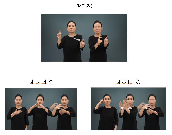 ‘확진(자)’수어는 ‘확진’과 ‘확진자’두 가지 의미로 사용되며 좀 더 명확한 소통을 위해 이 수어 앞에 특정 병명/감염증 등을 붙일 수 있다. ‘자가격리’는 현장에서 가장 많이 사용되는 두 가지 표현을 권장안으로 선정했다. 선정한 권장 수어는 국어원 누리집(http://www.korean.go.kr)의 ‘수어/점자 > 수어 > 새수어’에서 누구든지 확인할 수 있다.