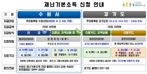 수원시민을 비롯한 모든 경기도민에게 1인당 10만 원을 ‘경기도 재난기본소득’은 4월 9일부터 7월 31일까지 신청할 수 있다. 3월 23일 자정 이전부터 신청일까지 경기도에 주민등록이 된 도민이 신청할 수 있다.