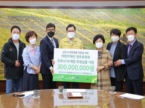 초록우산어린이재단 경북지역본부는 총 3억 원 상당의 후원 10건을 경주로 배분했으며, 코로나19 예방을 목적으로 저소득 아동(만18세 이하)을 선정해 700개 이상 가구에 배달상품권, 마스크, 손소독제, 식료품 등을 지원할 계획이다.
