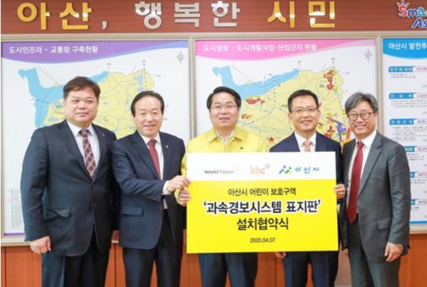 아산시(시장 오세현)는 4월 7일 시장실에서 아산시-월드비전-bhc와 어린이보호구역 과속경보시스템 설치 협약을 체결했다.