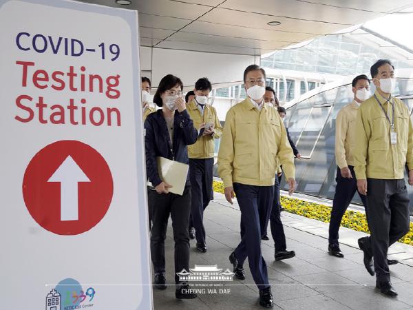 문 대통령은 직원들과 ‘코로나 극복 파이팅’, ‘코로나는 코리아를 이길 수 없다’ 구호와 함께 단체 기념촬영을 한 뒤 공항터미널 야외에 설치된 개방형 선별진료소(일명 오픈 워크 스루)를 방문하여 현황 설명을 청취하고 근무자들을 격려하는 것으로 일정을 마무리했다.