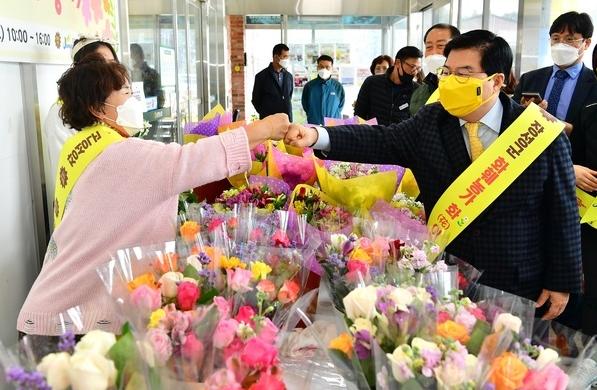 4일 장성군 진원?남면 농협 로컬푸드 직매장에서 ‘화훼농가 꽃사주기 화훼장터’가 열렸다. 코로나 사태로 어려움을 겪고 있는 화훼농가를 지원하기 위해 장성군이 마련했으며, 일요일인 5일에도 이어진다.