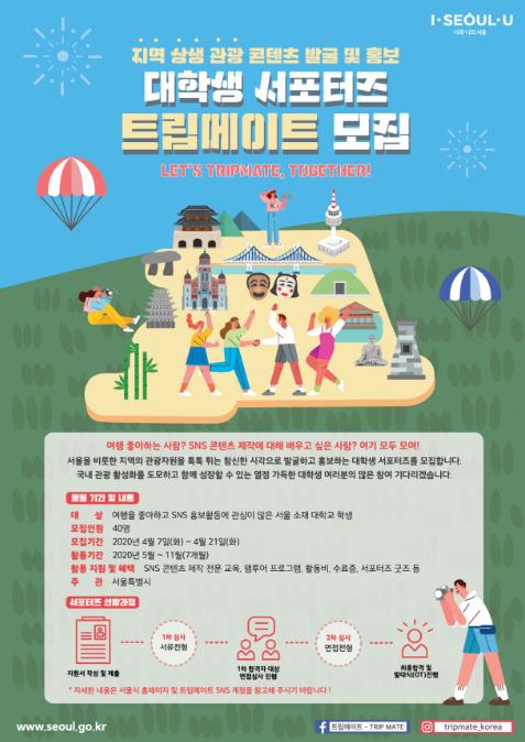 서울시는 숨은 관광자원을 발굴하고, 이를 통해 코로나19로 침체된 국내관광 시장에 활력을 불어넣기 위한 대학생 서포터즈 ‘트립 메이트’를 모집한다고 밝혔다. 모집기간은 4월 21일(화)까지이다.