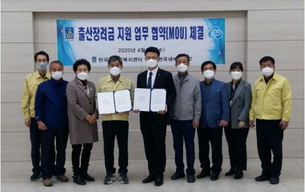 현곡면행정복지센터(면장 김창래)와 현곡새마을금고(이사장 황용석)은 8일 최근 심각한 사회문제로 대두되고 있는 저출산에 대응하기 위해 출산을 장려하는 분위기 조성을 위한 ‘출생축하통장’ 개설 업무협약을 체결했다.