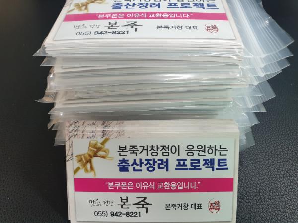 거창군은 본죽 거창점 김선주 대표가 셋째아이 이후 출산 가정을 위한 이유식 교환 쿠폰 500매(150만 원 상당)를 군에 기부했다고 8일 전했다.