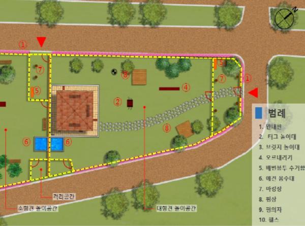 이 놀이터는 공원을 찾는 이용객과 반려견이 잔디 위에서 함께 뛰어놀 수 휴식공간으로 반려견을 위한 놀이시설과 음수대 및 벤치 등 휴게시설을 설치할 계획이다.