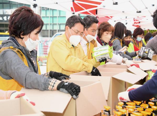 여수시에 따르면 8일 쌍봉종합사회복지관 주차장에서 권오봉 여수시장과 쌍봉종합사회복지관 직원, 활동지원사 등 55명이 참여한 가운데 ‘코로나19 극복, 희망 박스 포장 행사’가 열렸다.