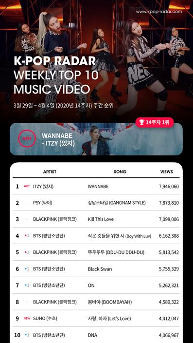 뿐만 아니라 싸이의 ‘강남스타일’(787만 뷰)를 비롯해 블랙핑크의 ‘킬 디스 러브(Kill This Love)’(709만 뷰), 방탄소년단의 ‘작은 것들을 위한 시(Boy With Luv)’(616만 뷰), 블랙핑크의 ‘뚜두뚜두(DDU-DU DDU-DU)’(581만 뷰), 방탄소년단의 ‘블랙 스완(Black Swan)’(575만 뷰), 방탄소년단의 ‘온(ON)’(526만 뷰), 블랙핑크의 ‘붐바야(BOOMBAYAH)’(458만 뷰), 방탄소년단 ‘DNA’(406만 뷰) 등이 14주 차 케이팝 레이더 주간 유튜브 조회수 차트 TOP10에 올랐다.