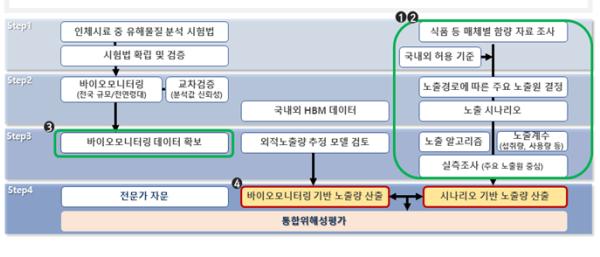 평가방법은 식품, 화장품, 위생용품, 공산품, 생활화학제품 및 환경요인 등 다양한 노출원과 노출경로를 분석하여 물질별 체내 총 노출 수준을 산출하고, 이를 물질별 인체노출 안전기준과 비교하는 방식으로 진행했다.