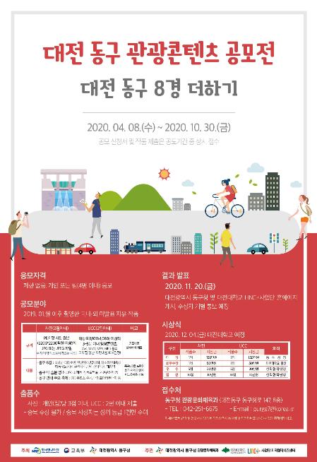 대전 동구(청장 황인호)는 동구의 아름다운 관광자원과 다채로운 축제 모습 등을 담은 양질의 사진 및 영상콘텐츠를 홍보하기 위해 제1회 ‘동구 관광콘텐츠 공모전’을 개최한다.