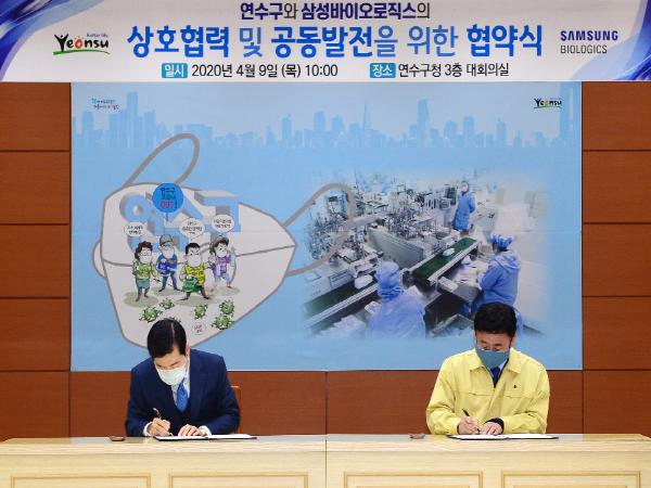 이를 위해 구는 9일 구청 대상황실에서 고남석 연수구청장과 김태한 삼성바이오로직스 대표, 양측 관계자 등이 참석한 가운데 공공마스크 공급체계 구축을 위한 업무협약을 체결했다.