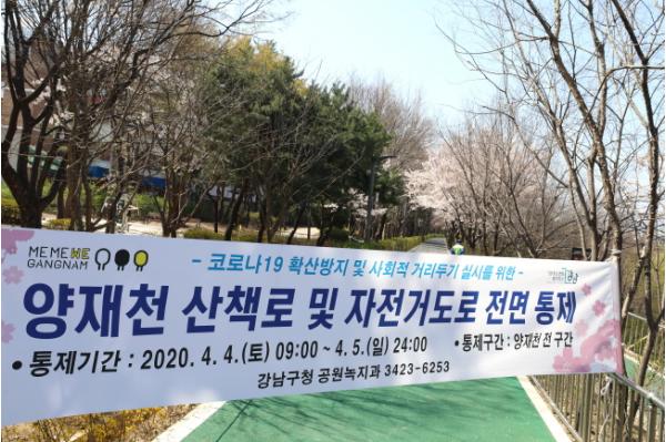 조은희 서초구청장과 정순균 강남구청장은 9일 오전 협의를 통해 11일(토) 오전 9시부터 12일(일) 자정까지 서초구·강남구 관내 8.55km 양재천 전구간을 폐쇄하기로 결정했다.
